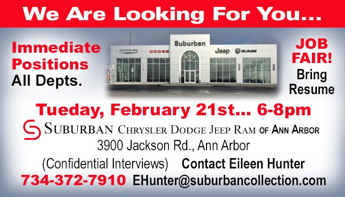 Parts & Service Coupons available in Ann Arbor, MI Check A/C Performance. list-bullet. Includes replacement of cabin air filter. Fee charged for additional freon and for replacement of major components, if required. Valid until 05-31-2022. OFFER CODE: F99074. Suburban CDJR of Ann Arbor. 3900 Jackson Rd.