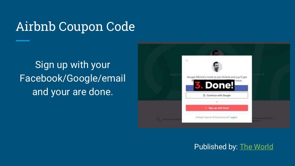Airbnb First Time Discount Code: $40 Airbnb Coupon PLUS How to Get an ... Simply sign up for a new account, and once you have made your first booking over $75, you'll get a discount coupon of $40, $35, $30 or equivalent in your local currency. Easy! This Airbnb discount code is the same for the USA, UK, Australia, Canada and the rest of the world, except the amount will vary slightly depending on currency fluctuations.