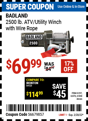 Harbor freight winch coupon code. Harbor Freight 30% Off Coupon 2022 - HotDeals.com 15% Off Single Badland Winch You Order. ... Today's offer: Get $25 Off Pittsburgh Mechanics Tool Set Applying This Harbor Freight Coupon Code. Expires: Oct 23, 2022. HAUL-MASTER 1/2 ton Capacity Hand Winch - Harbor Freight Coupons To receive the coupon prices online, the coupon code(s) must be entered into your shopping cart. At Harbor Freight Tools, the "Compare to" price means that the specified comparison, which is an item with the same or similar function, was advertised for sale at or above the "Compare to" price by another additional retailer in the U.S. within the ... Harbor Freight Coupons – Get New Coupon Codes on Generators ... To receive the coupon prices online, the coupon code(s) must be entered into your shopping cart. At Harbor Freight Tools, the "Compare to" price means that the specified comparison, which is an item with the same or similar function, was advertised for sale at or above the "Compare to" price by another additional retailer in the U.S. within the ... Harbor Freight Coupons – Harbor Freight Coupons Oct 18, 2022 · Posts about Harbor Freight Coupons written by ... BADLAND ZXR 9000 lb. Truck/SUV Winch for $309.99 ... To receive the coupon prices online, the coupon code(s) must be ...