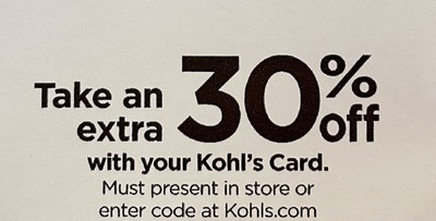 30% Off Kohl's Coupons & Black Friday Coupon Codes 30% Off Promo 🍁 Up To 30% Off Fall Exclusive W/ Kohl's Coupon 🍁 Click here to shop daily deals up to 50% off, PLUS take an extra 30%, 20%, or 15% off when you sign up and use your Kohl's card! Earn $10 Kohl's cash for every $50 you spend! Click here to shop and save now! Get Deal 93 used Up to 70% Off Promo