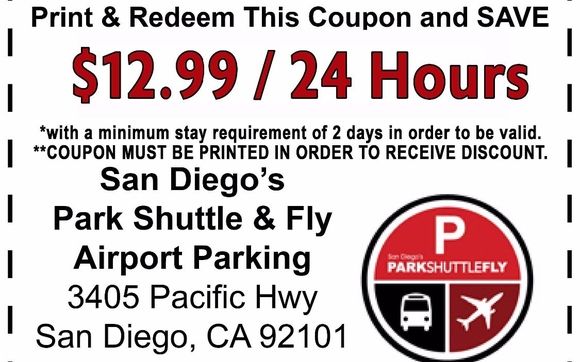 San Diego Airport Parking Deals - Groupon Parking at San Diego's Park, Shuttle & Fly Lot A. ... Take the hassle out of finding a space and save money with airport parking coupons. SAN San Diego Airport Parking Coupons & Promo Codes Enter Coupon Code SAN319 At the Checkout & Save $5.00 On Your Reservation · Save $5.00 on Airport Parking · Our Customers Favorite SAN Parking Lots · Coupon ... Coupon - San Diego Airport Parking Co. ADDRESS: 2771 Kurtz St.San Diego, CA. 92110. HOURS: Monday-Sunday 24/7. SHUTTLE HOURS: Monday-Sunday, 4:30 a.m.-Midnight. Call Us Anytime!